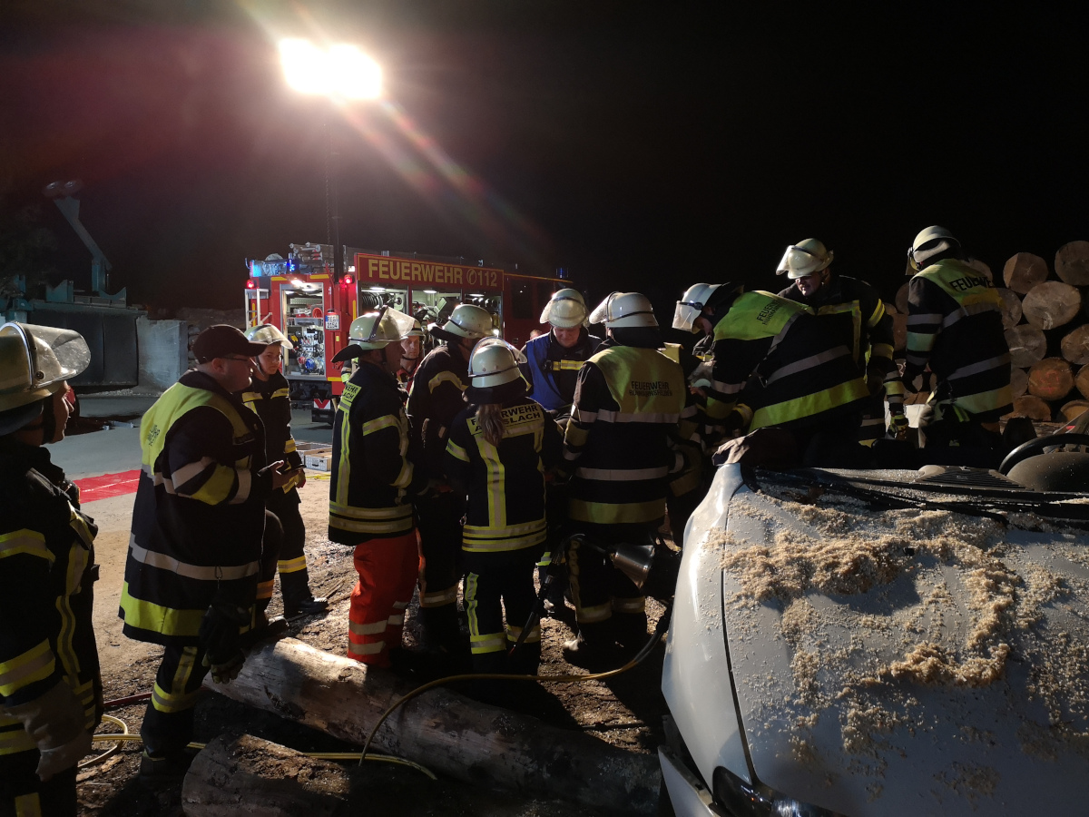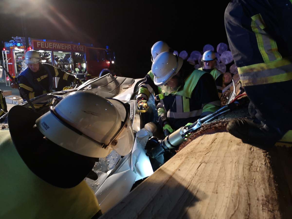 Zur Bergung der „Unfallopfer“ kamen Rettungsspreizer, Rettungsschere und Rettungszylinder zum Einsatz, ebenso ein Spineboard, mit dem die Verletzten letztendlich aus dem Wagen geholt wurden. Die noch „vermisste“ Person wurde eingeklemmt unter einem Holzstapel gefunden. Sie konnte mit Hilfe eines Rettungskissens geborgen werden.
