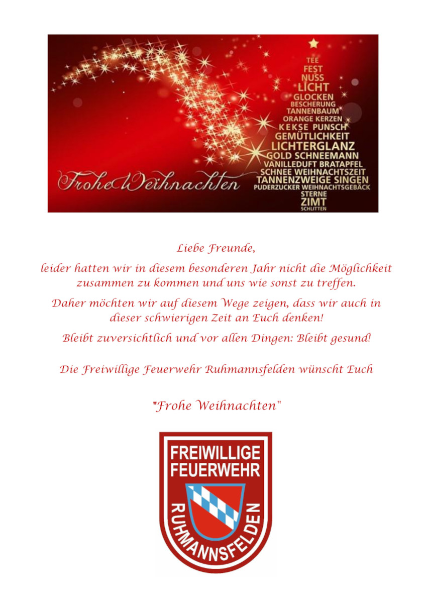 Wir wünschen allen Mitgliedern der Feuerwehr Ruhmannsfelden sowie der Gesamtbevölkerung Frohe und gesegnete Weihnachten!
