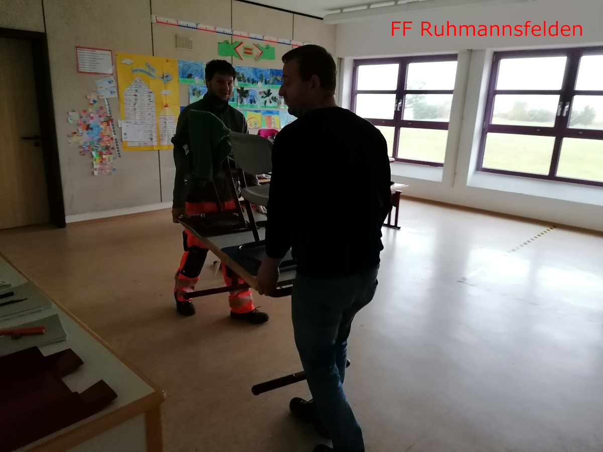 Feuerwehrleute unterstützten Hausmeister bei Umräum-Aktion an Grundschule Ruhmannsfelden