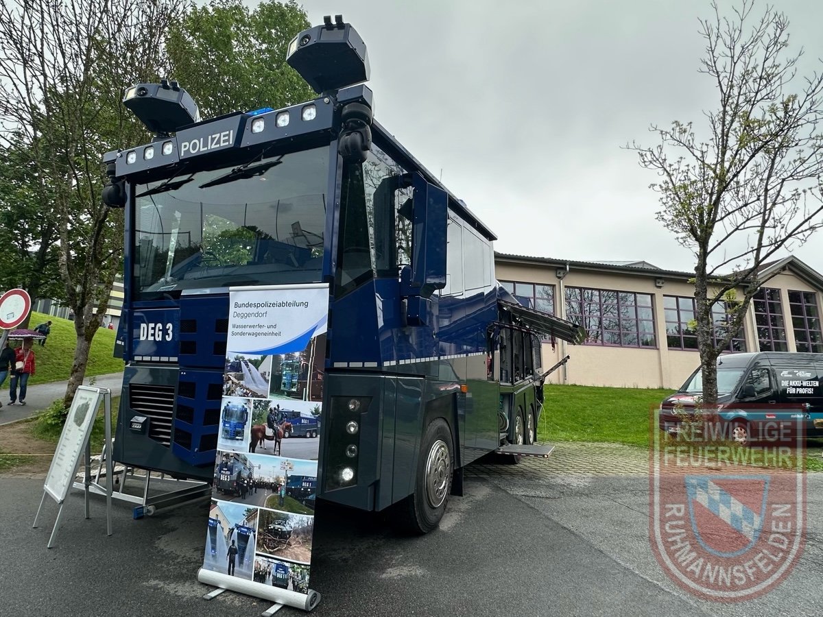 Die Vorführung des Wasserwerfers der Bundespolizeiabteilung Deggendorf sorgte für einen geballten Zuschauerrekord von mehreren hundert Leuten. Das 33 Tonnen schwere Fahrzeug mit rund 10000 Liter Wasserinhalt wird bei Katastrophen zur Wasserversorgung und bei Brandfällen eingesetzt.