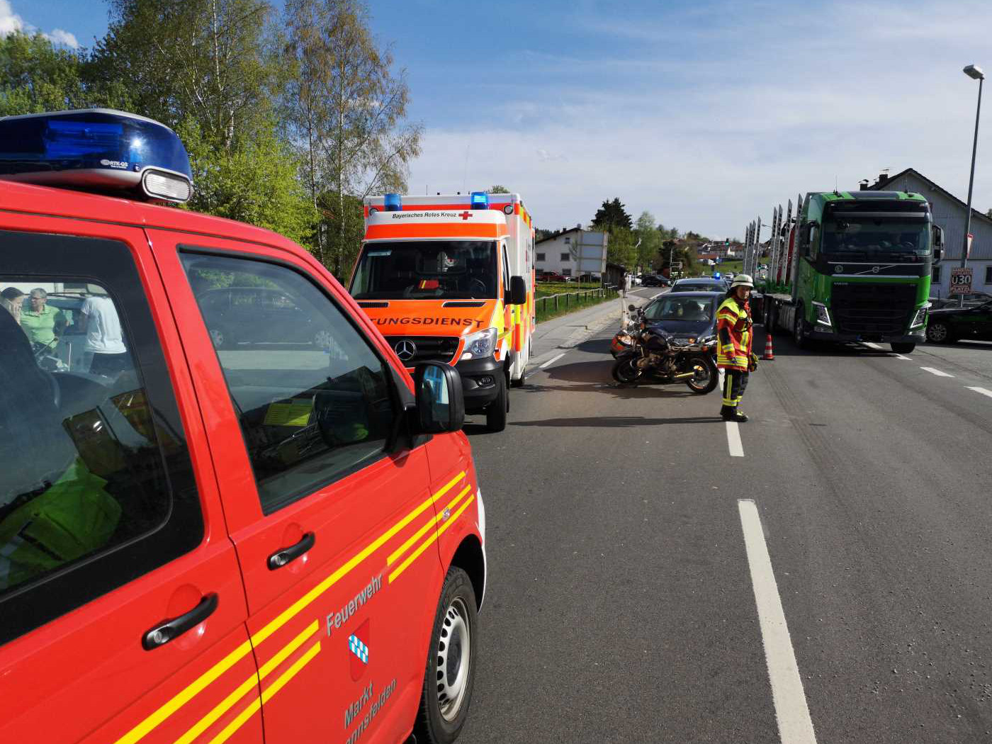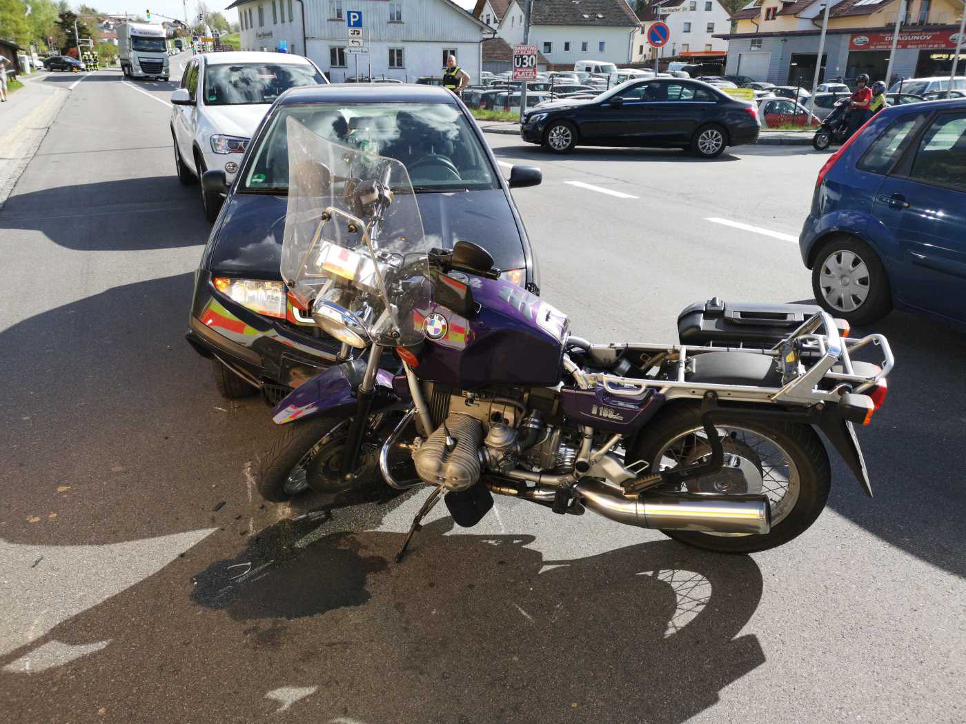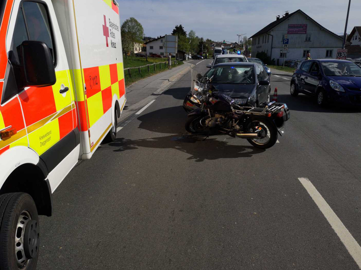 Der auf seinem Motorrad vorausfahrende Ehemann hatte den Crash über Funk mitbekommen und kehrte sofort an die Unfallstelle zurück. Seine Frau war durch den Zusammenstoß gestürzt und hatte sich mittelschwere Verletzungen zugezogen. Sie wurde mit dem Sanka nach Viechtach ins Krankenhaus gebracht. Die Fahrerin des Pkw blieb unverletzt. Den Sachschaden an den beiden beteiligten Fahrzeugen schätzt die Polizei auf zirka 4000 Euro.