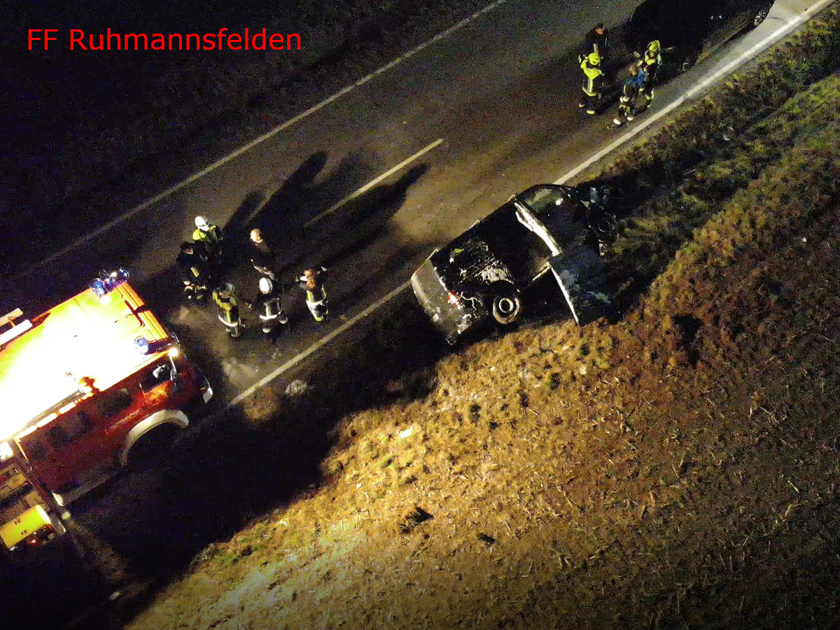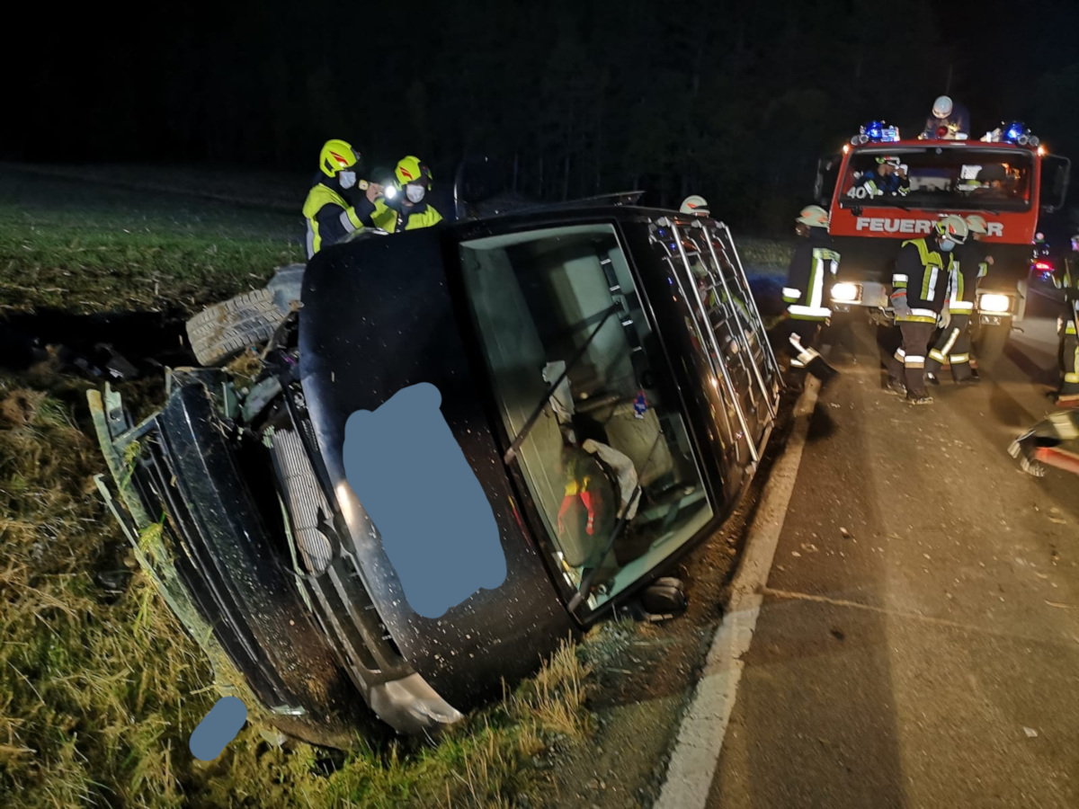 Das Fahrzeug landete im Straßengraben, prallte dort gegen einen Erdwall und blieb schließlich auf der Fahrerseite liegen. Beim Eintreffen der Rettungskräfte hatte sich der Mann bereits von der Unfallstelle entfernt und konnte trotz Fahndung mit Drohne und Wärmebildkamera nicht gefunden werden.