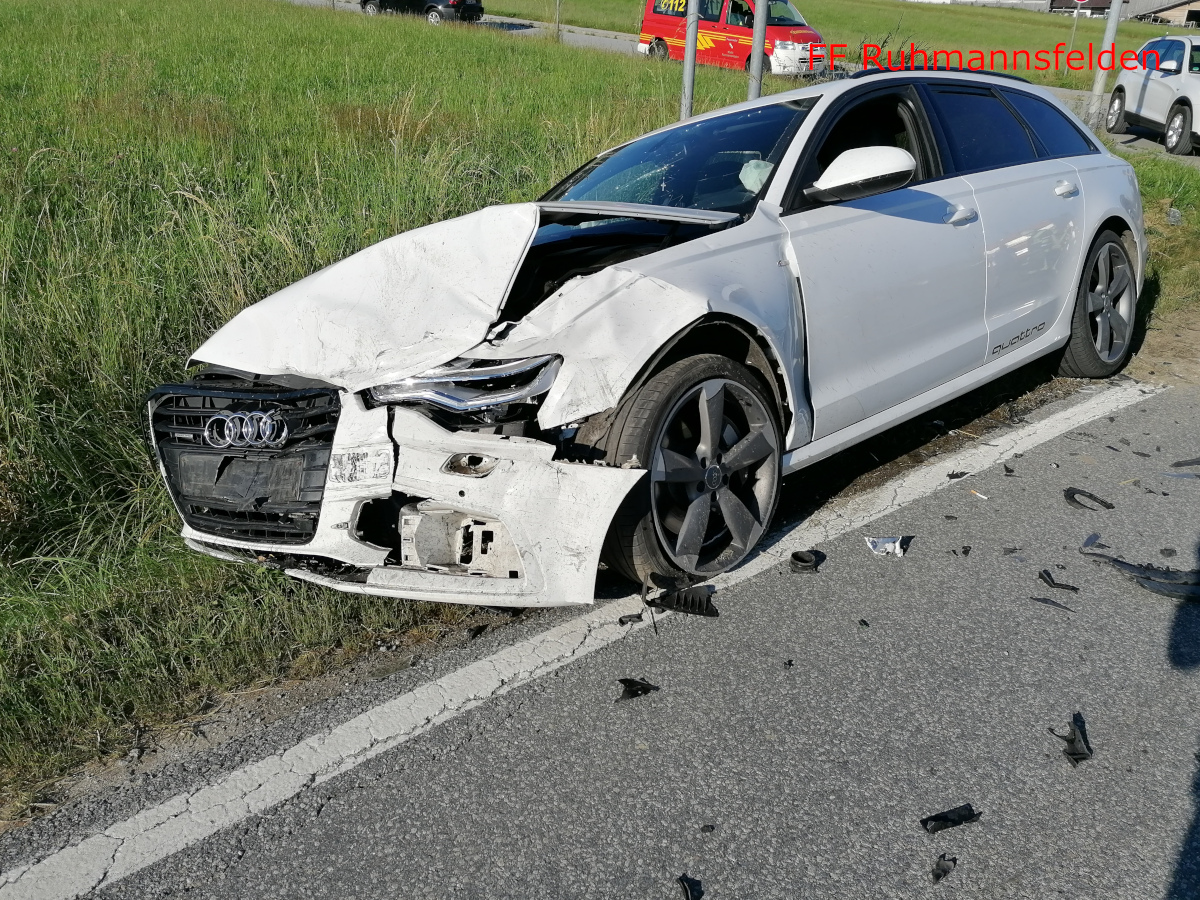 Am Freitag gegen 18.30 Uhr ist ein 19-Jähriger mit einem Audi in Ruhmannsfelden auf der Marcher Straße gefahren. Er kam aus Richtung der B11 und wollte anschließend nach links in die Straße Am Lerchenfeld einbiegen. Aufgrund eines vor ihm fahrenden Gespanns mit Heuballen übersah er beim Einbiegen einen aus der Gegenrichtung kommenden 33-Jährigen, ebenfalls mit einem Audi. Beide Fahrzeuge prallten frontal zusammen, so dass jeweils Totalschaden entstand. Beide Fahrer waren zudem leicht verletzt und wurden vom Roten Kreuz zur Untersuchung ins Klinikum Deggendorf gebracht. Erste Hilfe leistete zudem die Bergwachtbereitschaft Ruhmannsfelden mit Anita und Klaus Schober. Zur Absicherung der Unfallstelle war die FFW Ruhmannsfelden vor Ort. − dr