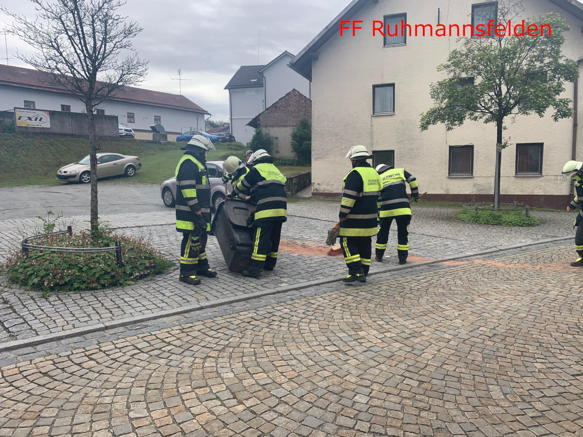Ölflecken beseitigen nach Abschleppen eines defekten Fahrzeuges.
