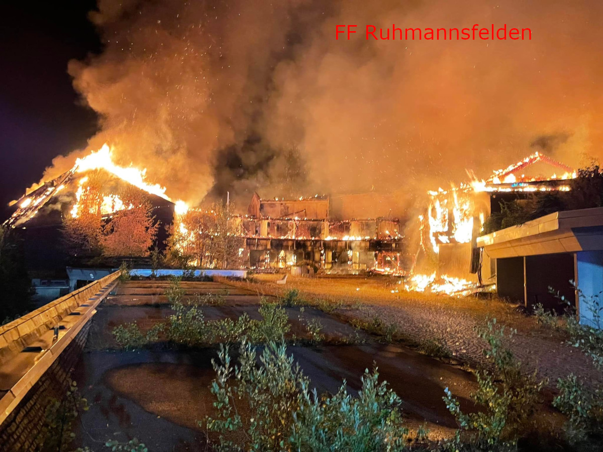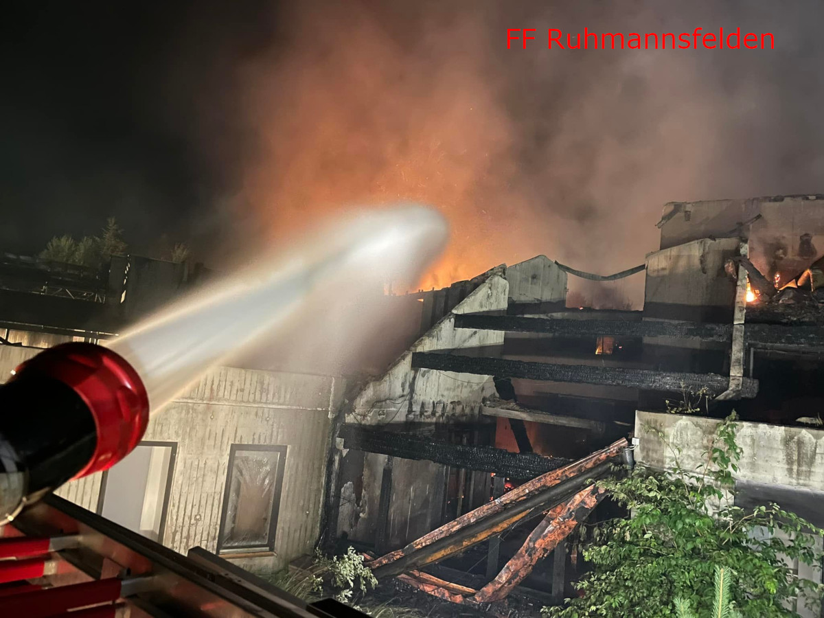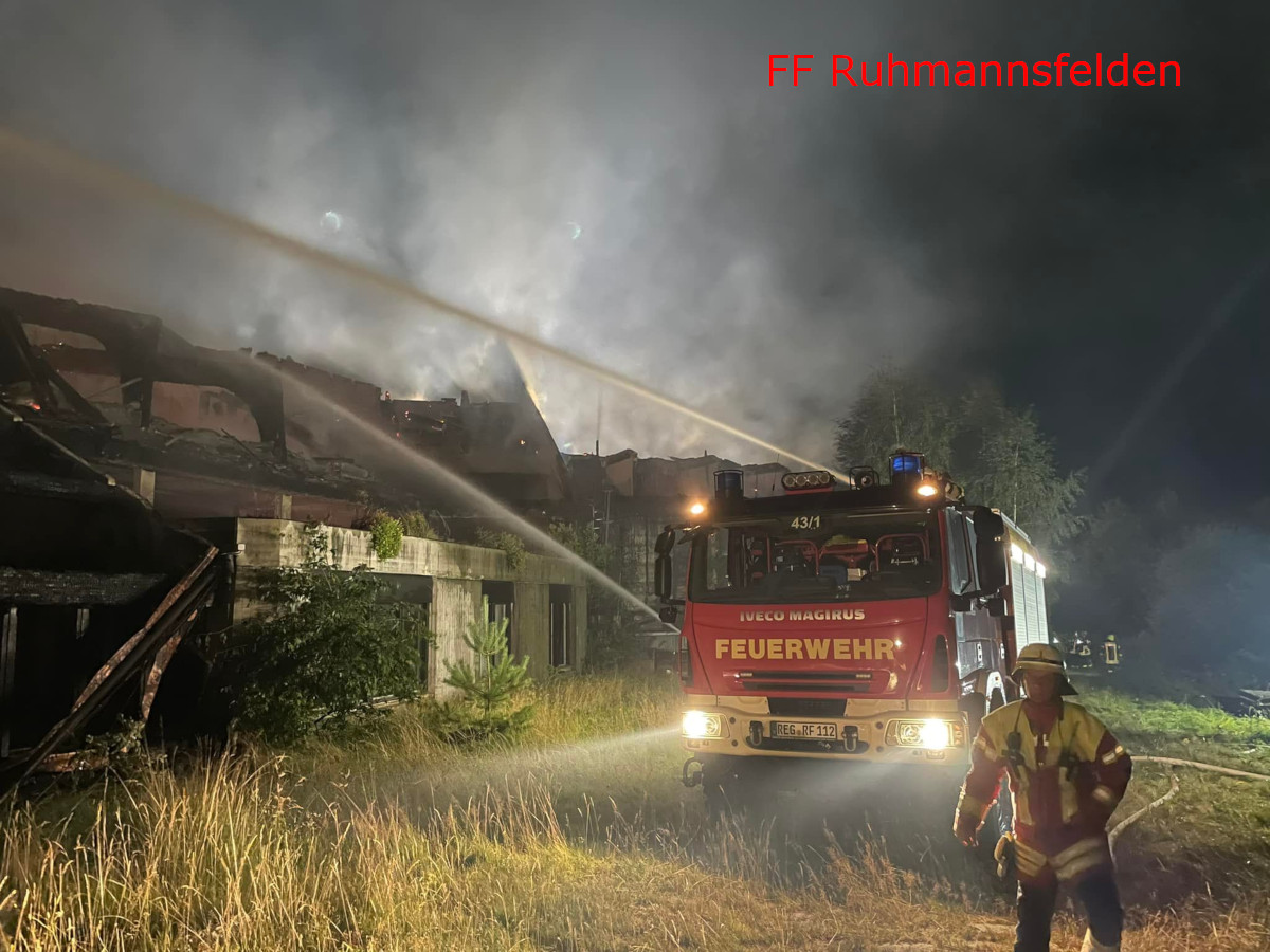Am 23.07.2022 wurden wir wie viele andere Wehren zum Brand eines verlassen Hotels alarmiert. Bereits im Feuerwehrhaus konnten wir den Feuerschein sehen. Vor Ort verlegten wir mit unserem SW die Leitungen vom Feuerwehrhaus Habischried zum Brandobjekt. Unser 43/1 übernahm mit der TS die erste Verstärkerpumpe und diverse Einsatzaufträge wie Aufbau von Lichtmast, Löschangriff und Verlegen der Leitungen am Objekt. In den Morgenstunden lösten wir die Drehleiter ab und löschten mit dem Dachmonitor diverse Flammherde ab.