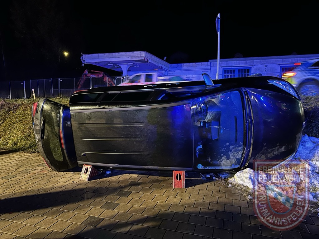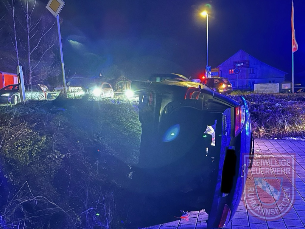 Kurz vor der Ampelkreuzung in der Ortsmitte erkannte er zu spät, dass das vorausfahrende Fahrzeug bremste. Um einen Zusammenstoß zu vermeiden, wich der Mazda-Fahrer nach rechts aus und fuhr die Böschung hinunter. Das Auto kippte dabei auf die Beifahrerseite und kam auf dem Parkplatz des dortigen Getränkemarktes zum Liegen.